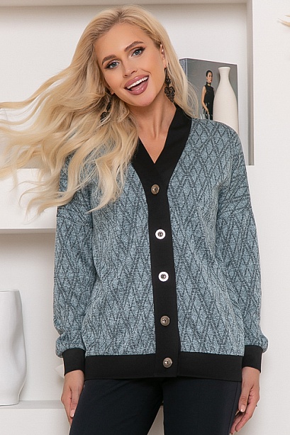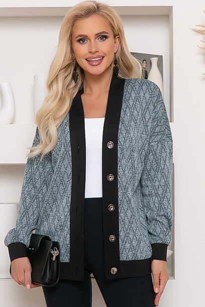 Кардиган из трикотажного полотна с контрастной отделкой и застежкой на петли и пуговицы по центру.