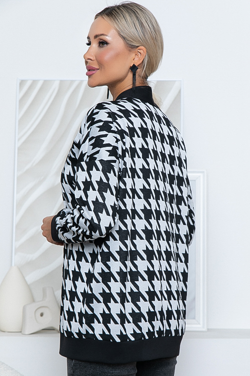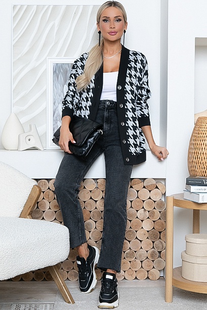 Кардиган свободного силуэта из жаккардового трикотажного полотна в гусиную лапку с однотонной отделкой и центральной застежкой на петли и пуговицы.