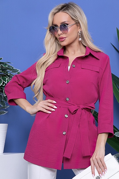 Жакет свободного силуэта из текстильного полотна с центральной застежкой на пуговицы.Воротник отложной на стойке.По полочке декоративные клапана,по бокам функциональные карманы.Пояс из основной ткани в комплекте.