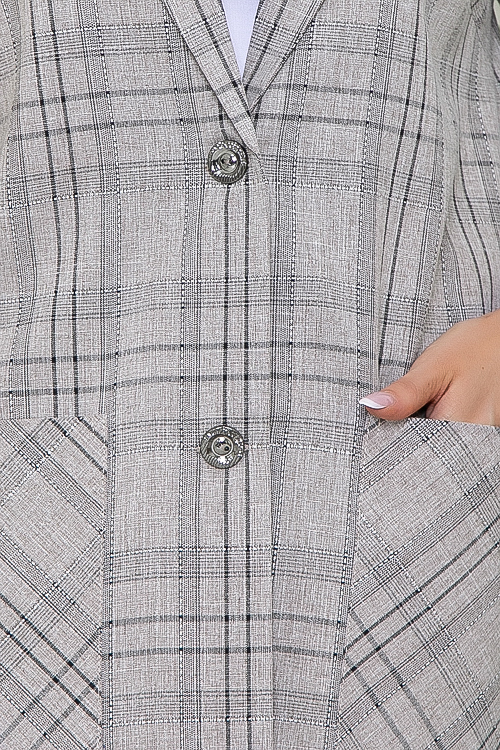 Жакет из комфортной,качественной костюмной ткани свободного силуэта,в боковых швах разрезы.Центральная застежка на две пуговицы.По переду удобные накладные карманы.Рукава втачные.