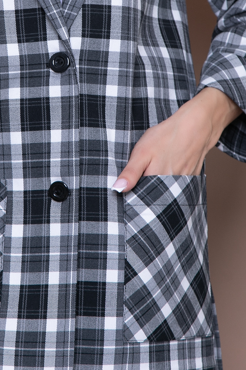 - Жакет из комфортной,качественной костюмной ткани свободного силуэта,в боковых швах разрезы.Центральная застежка на две пуговицы.По переду удобные накладные карманы.