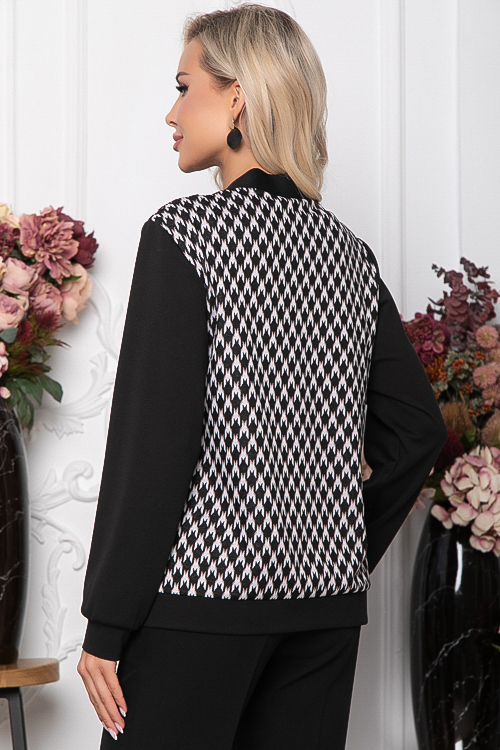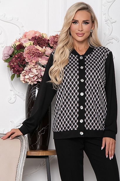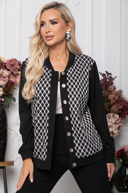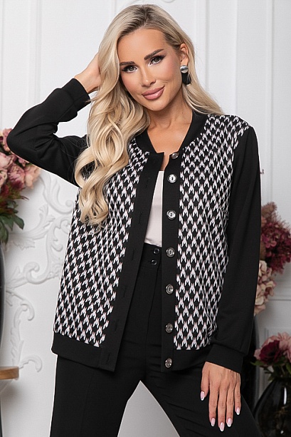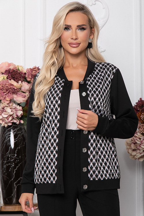 Комбинированный жакет из жаккардового трикотажного полотна и черного джерси с центральной застежкой на петли и пуговицы.