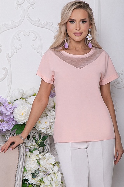 Блузка из текстильного полотна с цельнокроеными рукавами.По горловине украшена мягкой сеткой с легким люрексом.