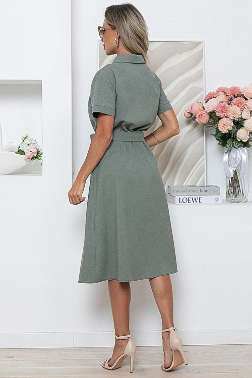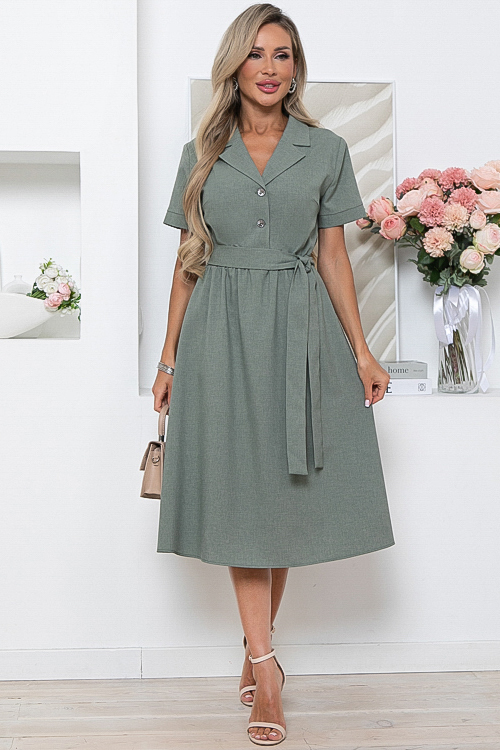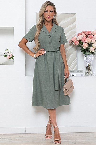 Платье из комфортной костюмной ткани ,отрезное по линии талии, присборено на резину с расклешенной юбкой.Лиф изделия с центральной застежкой и отложным воротником с лацканами.Пояс из основной ткани в комплекте.