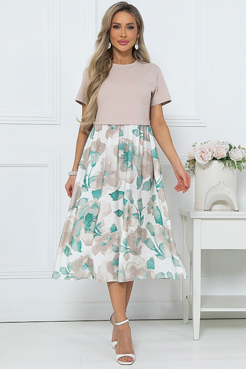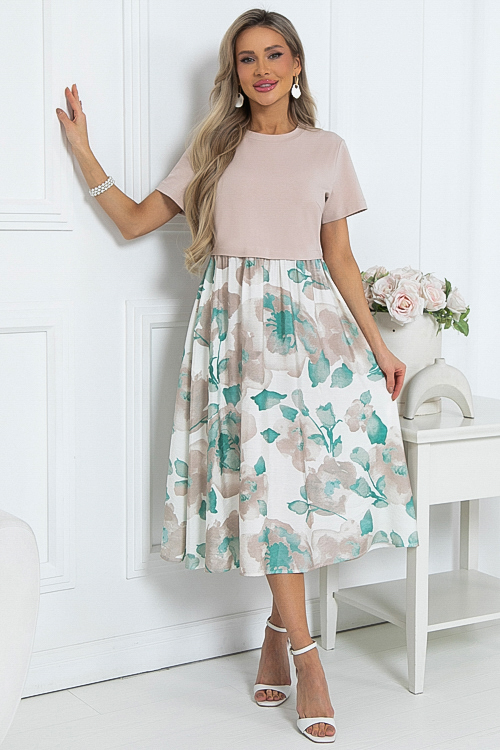 Комбинированное платье из двух видов ткани свободного силуэта с расклешенной юбкой и функциональными карманами по бокам.Верх из хлопкового трикотажа кулирка.Юбка из легкого вискозного текстильного полотна.