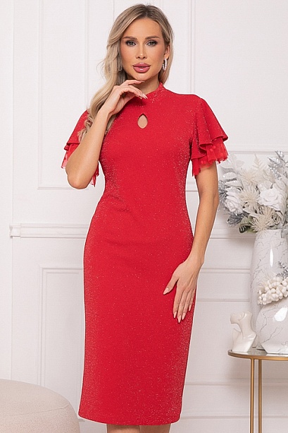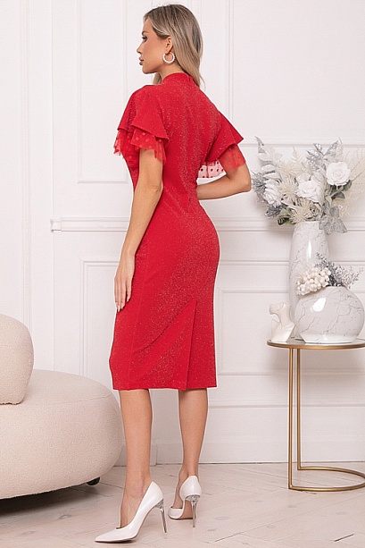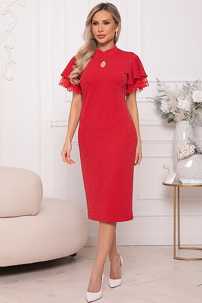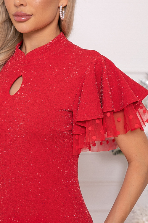 - Нарядное платье из трикотажного полотна с легким люрексом полуприлегающего силуэта.Горловина с фигурной стойкой.По полочке эффектная капля.Романтический образ дополняют двойные рукава воланы,верхний из основного трикотажа,нижний из сетки.В среднем шве спинки застежка молния и шлица по низу.