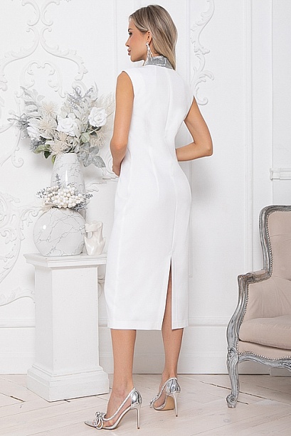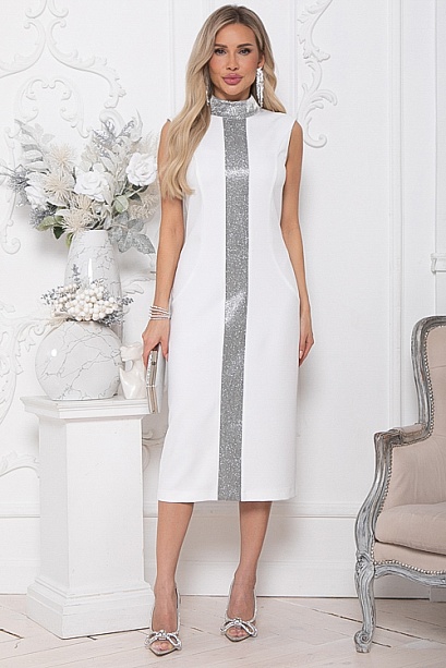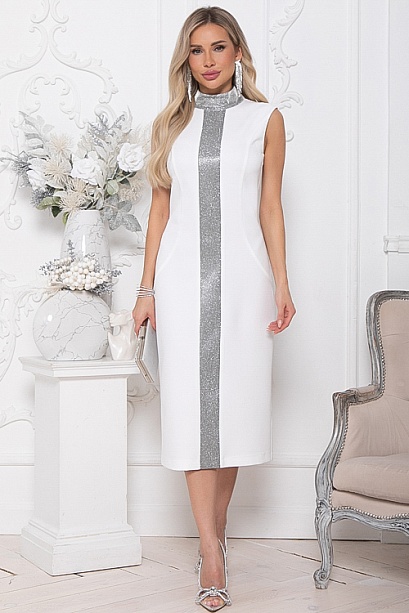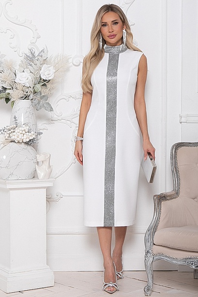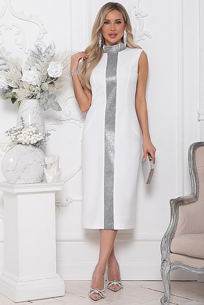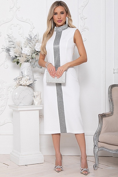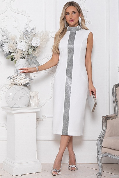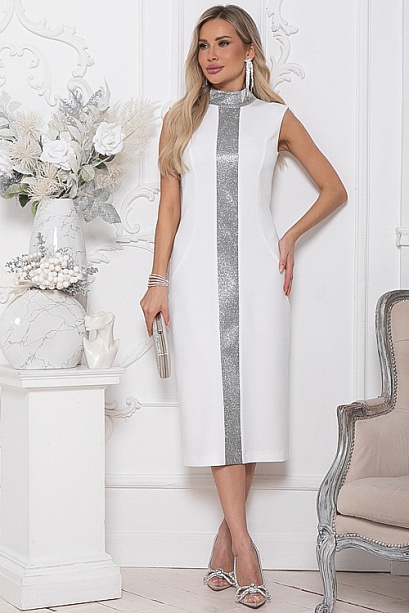 - Платье из костюмной ткани полуприлегающего силуэта.В среднем шве спинки застежка молния и разрез по низу.По переду декоративная вставка из трикотажа с блеском.
