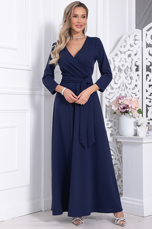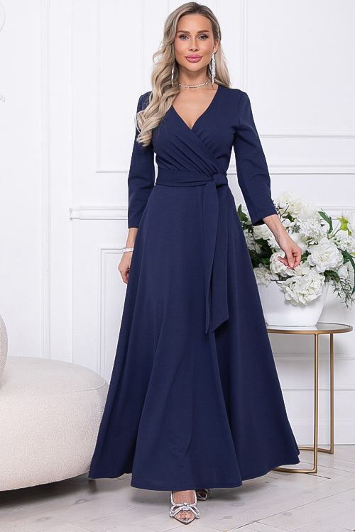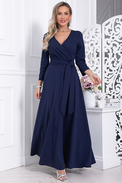 - Нарядное элегантное платье из трикотажного полотна,отрезное по лини талии с расклешенной юбкой.Лиф платья с полным запахом,задрапированным по линии талии.Пояс из основной ткани в комплекте.