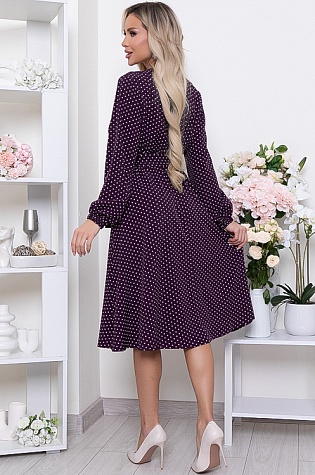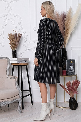 Платье из комфортного жаккардового трикотажного полотна в горох прямого,свободного силуэта с кулиской по талии.Рукав втачной оканчивающийся эластичными подвязами из трикотажной рибаны.В среднем шве спинки шлица.