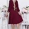 Платье из текстильного полотна,отрезное по линии талии,присобрано на эластичную резину.Горловина оформлена отложным воротником на стойке.По полочке-планка до талии с застежкой на петли и пуговицы.Юбка изделия расклешенная и летящая.В комплекте длинный пояс из основной ткани.