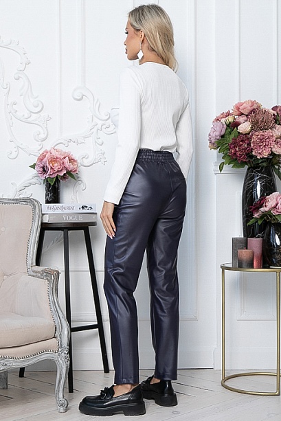 Комфортные брюки из экокожи,в боковых швах функциональные карманы,удобную посадку по талии обеспечивает эластичный пояс на резинке.