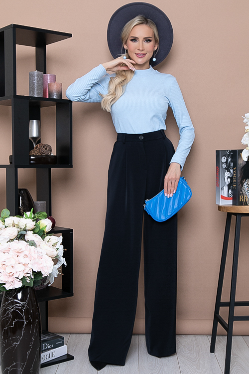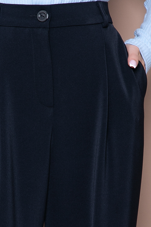 - Брюки-палаццо из комфортной костюмной ткани,с высокой посадкой по талии,застегивающиеся на молнию в гульфике.По переду от пояса застрочены мягкие складки.В боковых швах функциональные карманы.Пояс притачной,застегивающийся на одну пуговицу,посаженный по спинке на резину.