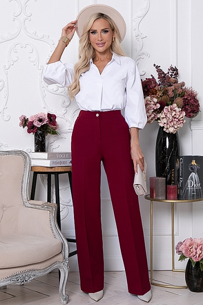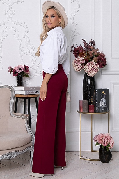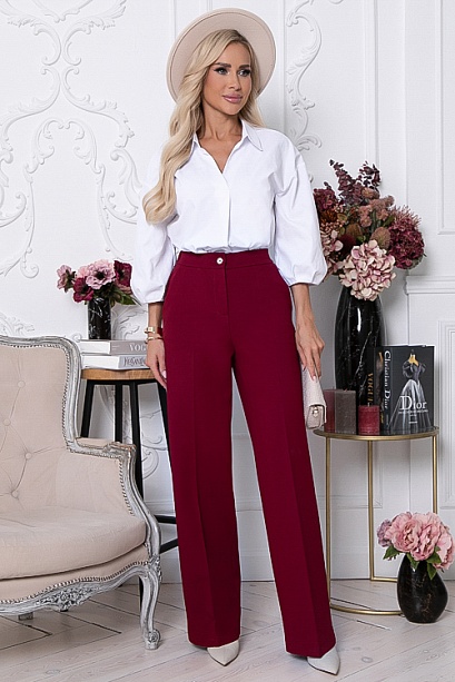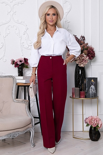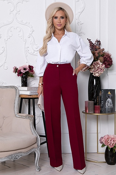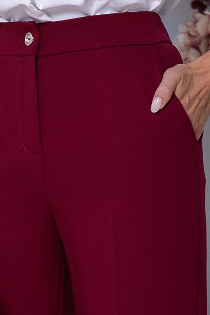 • Брюки из плотного хорошо держащего форму жаккардового трикотажного полотна  с заутюженными стрелками. Брюки с высокой посадкой по талии  застегивающиеся на молнию в гульфике. Пояс притачной с застежкой на пуговицу. Для удобства в носке пояс по спинке собран на резину. По бокам подрезные функциональные карманы.