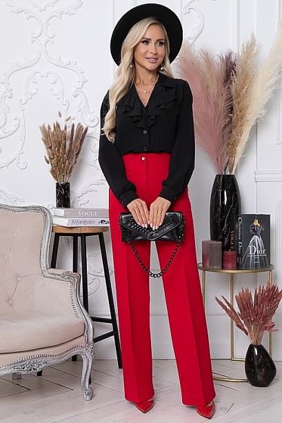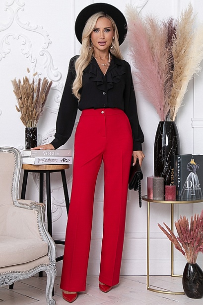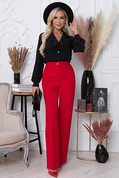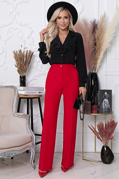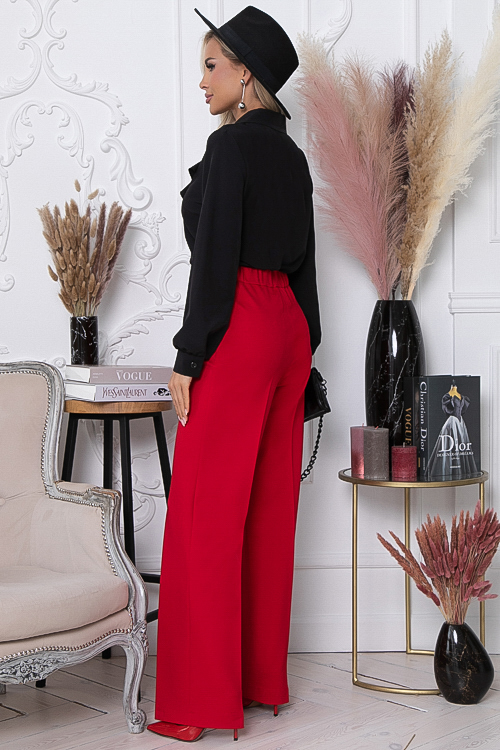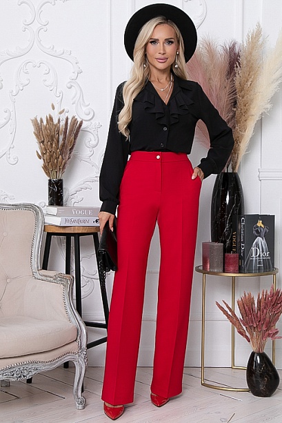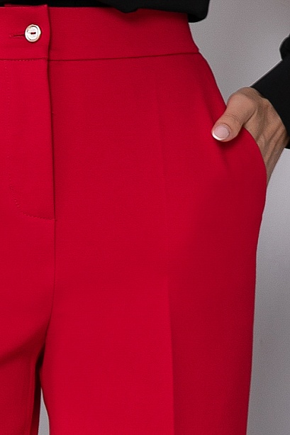 - Брюки из плотного хорошо держащего форму жаккардового трикотажного полотна с заутюженными стрелками. Брюки с высокой посадкой по талии застегивающиеся на молнию в гульфике. Пояс притачной с застежкой на пуговицу. Для удобства в носке пояс по спинке собран на резину. По бокам подрезные функциональные карманы.