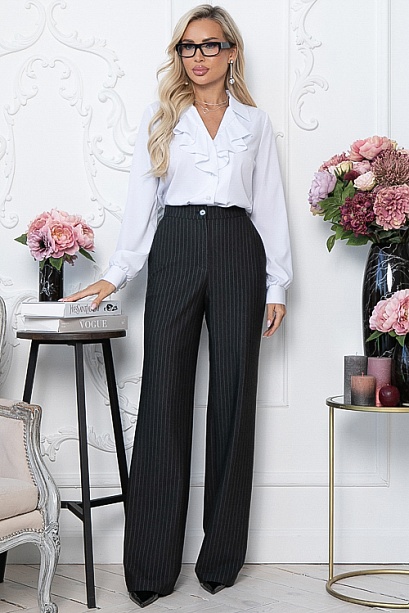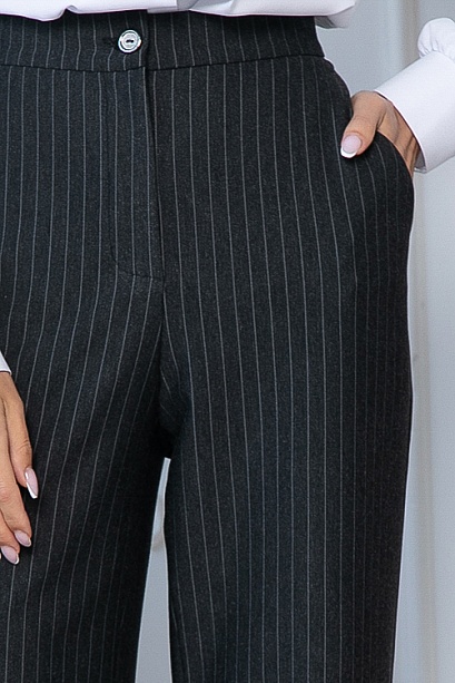 • Брюки из плотного хорошо держащего форму  трикотажного полотна в полоску, с высокой посадкой по талии  застегивающиеся на молнию в гульфике.Пояс притачной с застежкой на пуговицу.Для удобства в носке пояс по спинке собран на резину.По бокам подрезные функциональные карманы.
