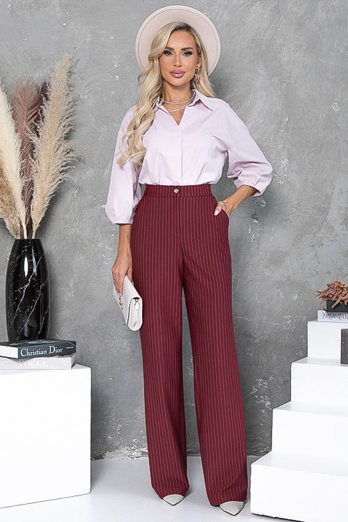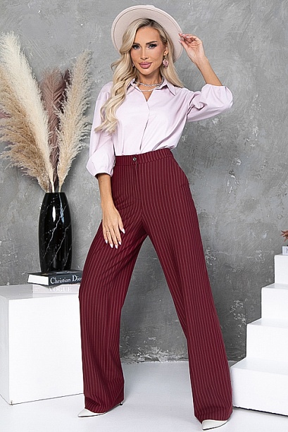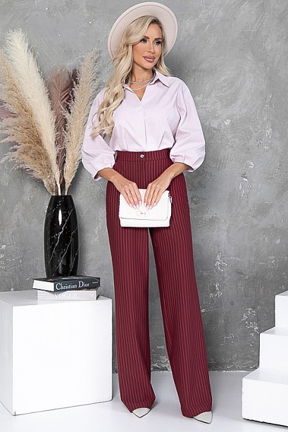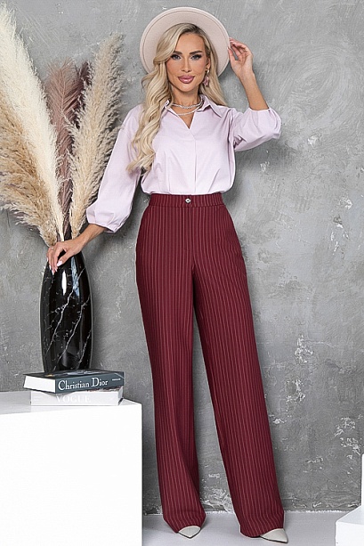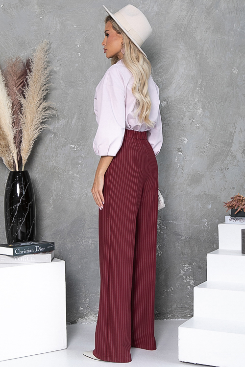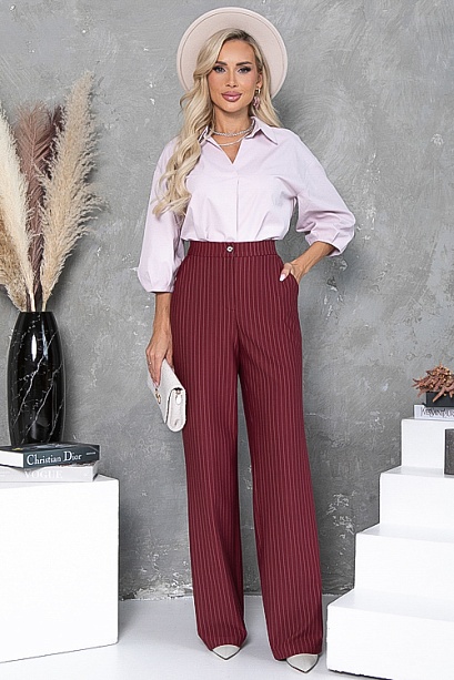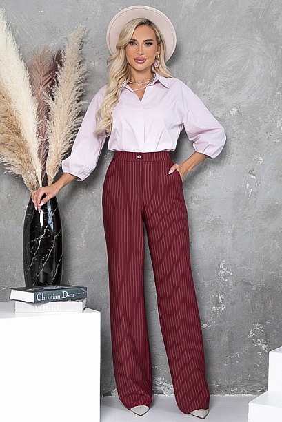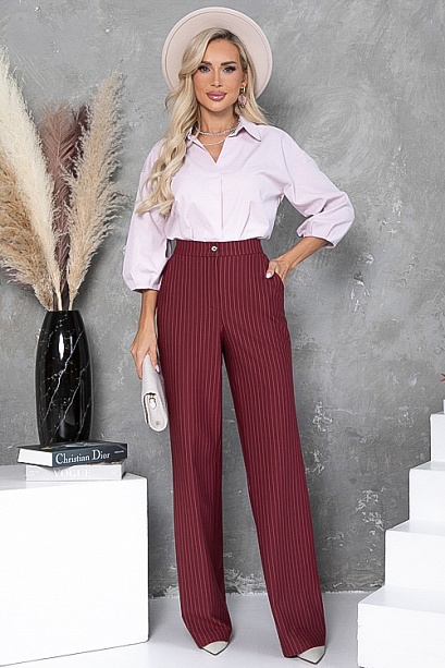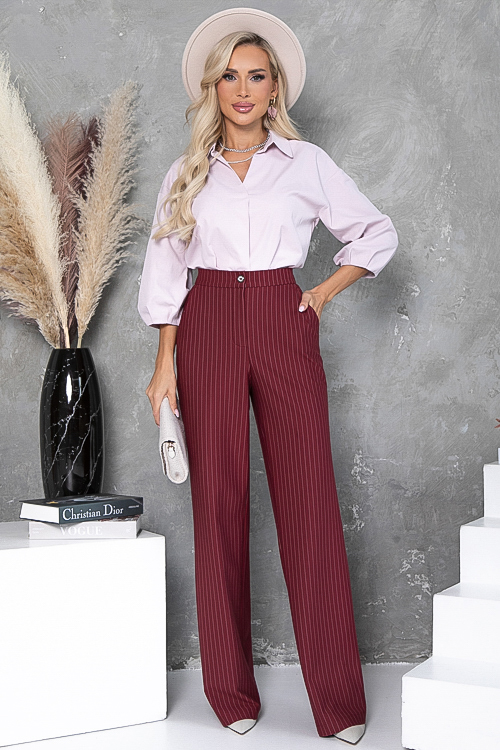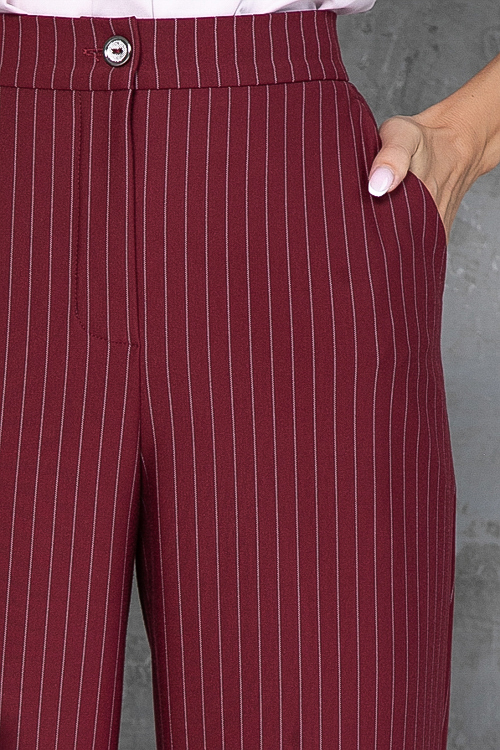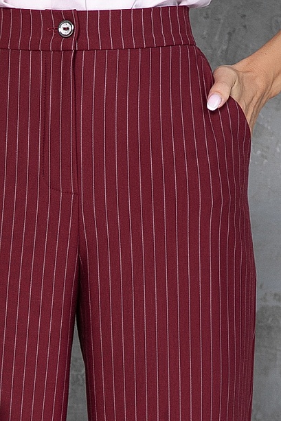 - Брюки из плотного хорошо держащего форму трикотажного полотна в полоску, с высокой посадкой по талии застегивающиеся на молнию в гульфике.Пояс притачной с застежкой на пуговицу. Для удобства в носке пояс по спинке собран на резину. По бокам подрезные функциональные карманы.
