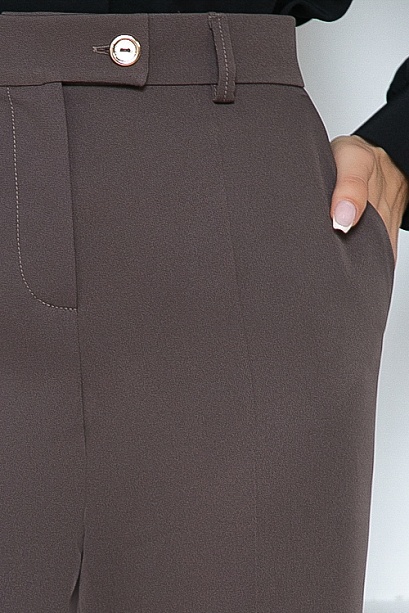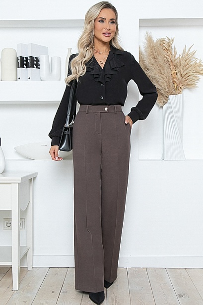 Брюки из костюмной ткани прямого силуэта с высокой посадкой по талии и заутюженными стрелками.По центру застежка гульфик-молния.Пояс притачной застегивающийся на пуговицу.Для удобства в носке пояс по спинке собран на резину.В боковых швах расположены функциональные карманы с отрезным бочком.По поясу настрочены шлевки.