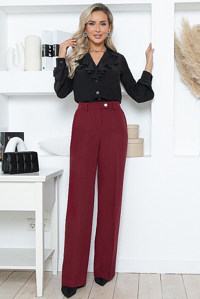Брюки из костюмной ткани прямого силуэта с высокой посадкой по талии и заутюженными стрелками.По центру застежка гульфик-молния.Пояс притачной застегивающийся на пуговицу.Для удобства в носке пояс по спинке собран на резину.В боковых швах расположены функциональные карманы с отрезным бочком.По поясу настрочены шлевки.