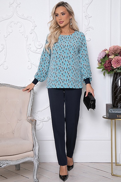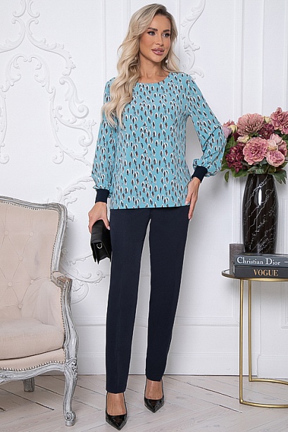 - Комплект состоящий из блузки и брюк. Блузка свободного силуэта из текстильного полотна, низ рукавов с манжетами из трикотажной рибаны.Брюки из костюмной ткани с высокой посадкой, зауженные к низу, по поясу эластичная резина .В среднем шве переда имитация гульфика. По бокам функциональные карманы. Заутюженные стрелки придают стройность фигуре.