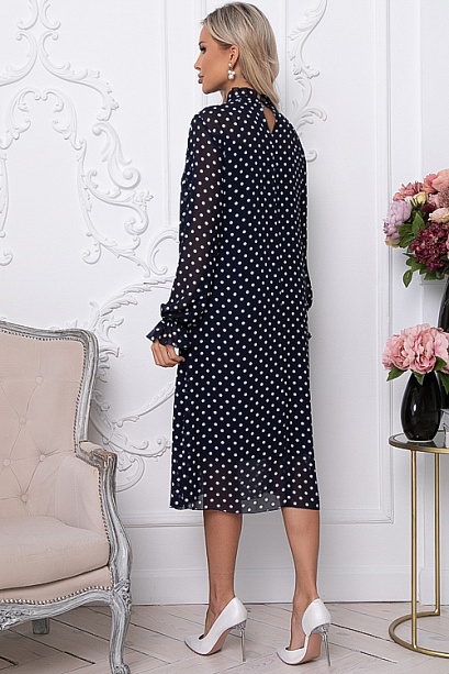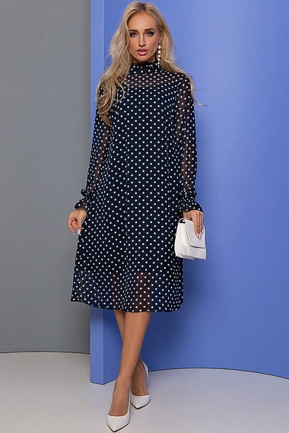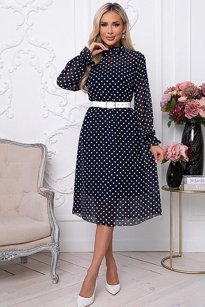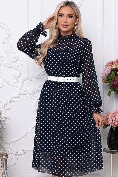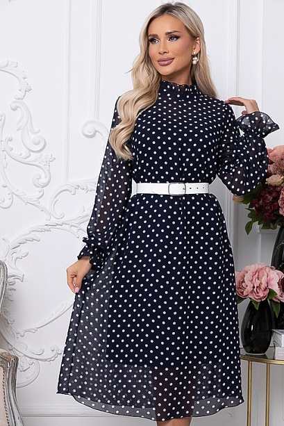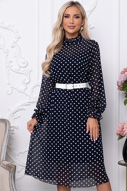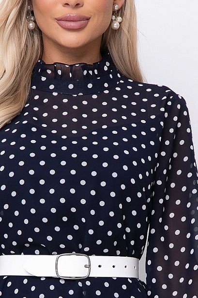• Платье трапецевидного силуэта из шифона в горох.Ворот стойка с рюшей с застежкой сзади на петли и пуговицы.Изделие посажено на трикотажный подклад.Ремень в комплект не входит.Цвет: т.синий.