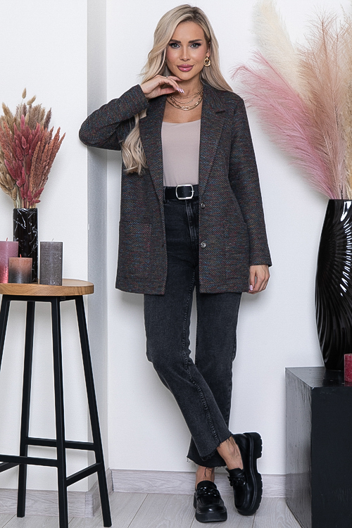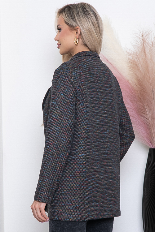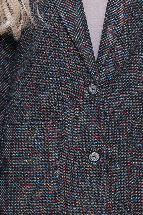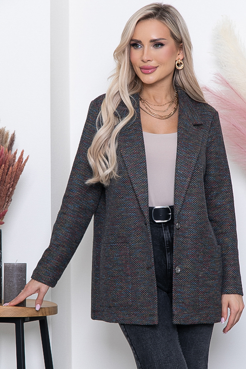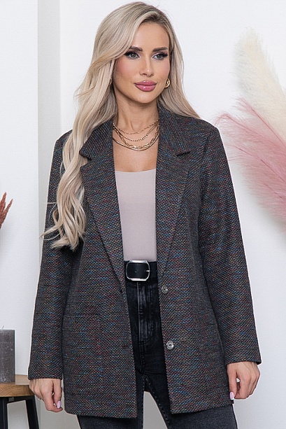 - Жакет прямого,свободного силуэта из плотного буклированного трикотажа.По переду центральная застежка на две пуговицы и удобные накладные карманы.