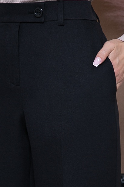 Брюки из костюмной ткани прямого силуэта с высокой посадкой по талии и заутюженными стрелками.По центру застежка гульфик-молния.Пояс притачной застегивающийся на пуговицу.Для удобства в носке пояс по спинке собран на резину.В боковых швах расположены функциональные карманы с отрезным бочком.По поясу настрочены шлевки.