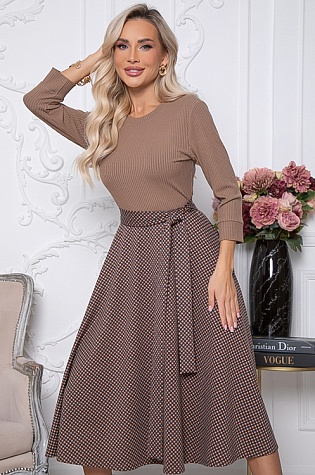 Платье из жаккардового трикотажного полотна в гусиную лапку с контрастной отделкой,отрезное по линии талии с расклешенной юбкой и застежкой на молнию до талии.