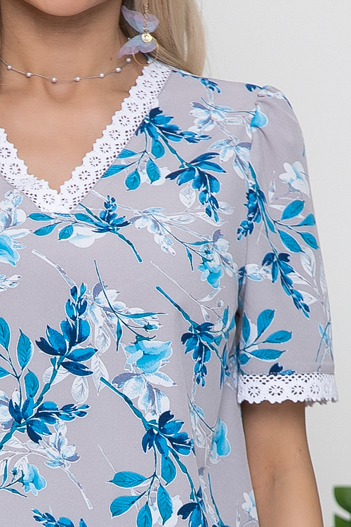 Блузка из текстильного полотна свободного силуэта с V-вырезом горловины и отделкой хлопковым кружевом.