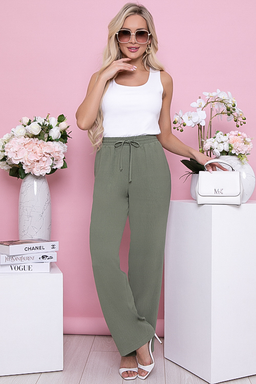 Брюки свободного,прямого силуэта из комфортного текстильного полотна с посадкой по талии присборенные на эластичную резину.В боковых швах функциональные карманы.