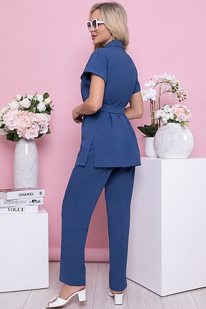 Комплект брючный двух предметный.Брюки с высокой посадкой, прямого силуэта, по поясу эластичная резина,без застежки с имитацией гульфика.Жакет свободного силуэта с центральной застежкой на пуговицы и разрезами в боковых швах.Рукава цельнокроеные с отложной манжетой.Воротник отложной на стойке.Пояс из основной ткани в комплекте.