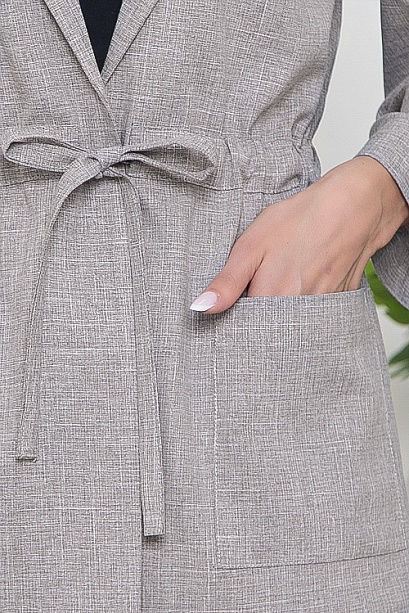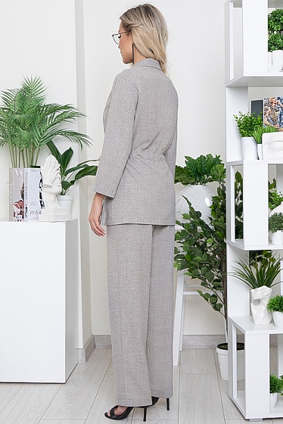 Брючный комплект из легкой,комфортной костюмной ткани.Жакет свободного силуэта.Воротник отложной с лацканами.По полочке функциональные накладные карманы.Брюки свободного,прямого силуэта, удобную посадку по талии обеспечивает эластичный пояс на резинке,в боковых швах функциональные карманы.