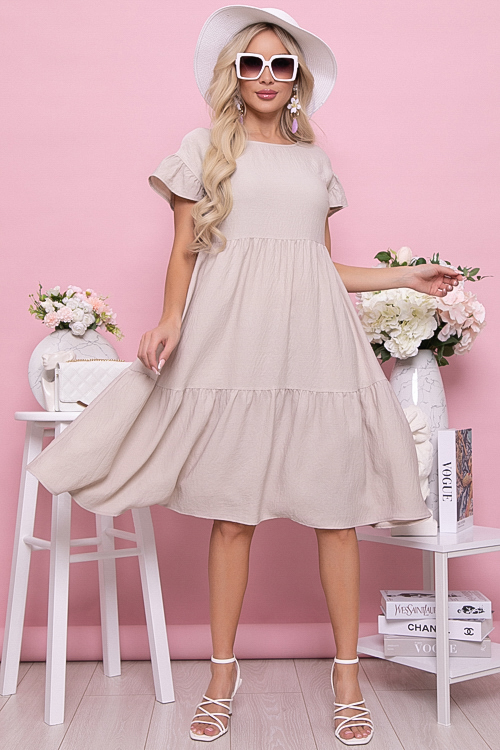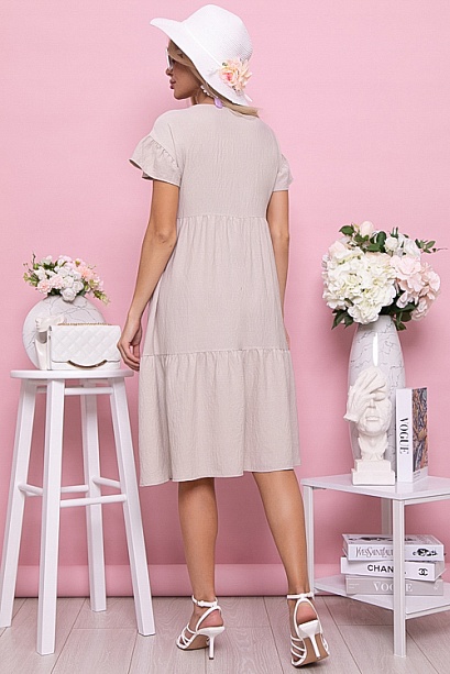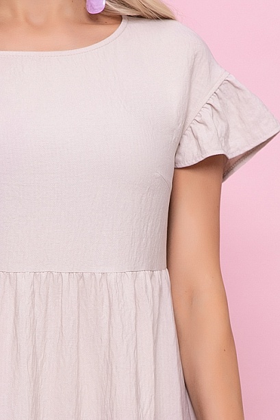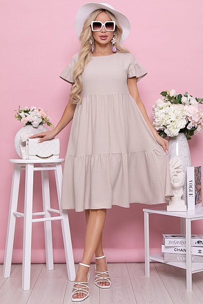 Платье из текстильного полотна свободного А-образного силуэта с двумя ярусами оборок.