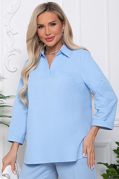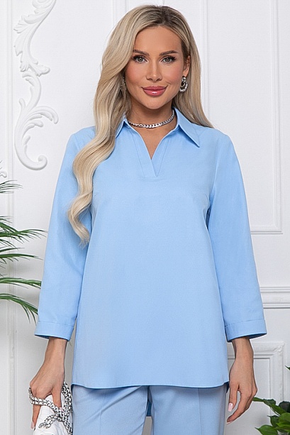 - Блузка из текстильного полотна свободного силуэта.Горловина с V-образным вырезом и отложным воротником на стойке.