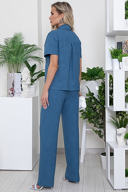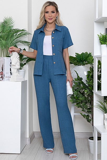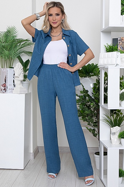 - Брючный комплект из комфортного текстильного полотна.Рубашка свободного силуэта с отложным воротником на стойке и центральной застежкой на пуговицы.По переду накладные карманы.Брюки свободного,прямого силуэта с эластичной резиной по поясу и функциональными карманами по бокам.