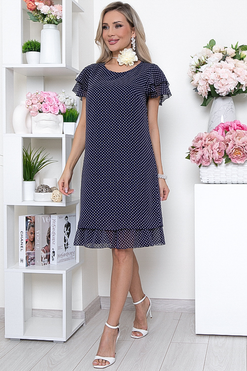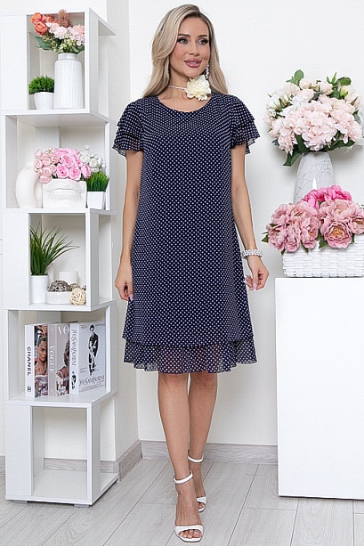- Платье из шифона А-образного силуэта.Круглая горловина обработана косой бейкой,переходящей по спинке в завязки.Мягкий драпирующийся рукав - двойное крылышко.Легкий волан по низу платья,притаченный к трикотажному подкладу,создает эффект двухслойности.
