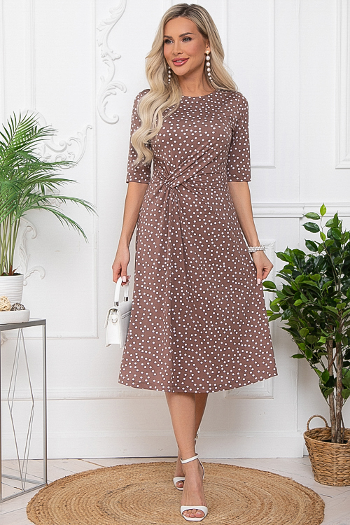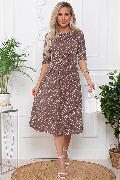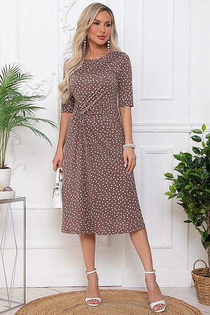 - Платье из трикотажного полотна А-образного силуэта. Перед платья с эффектной драпировкой в области талии с одной стороны.