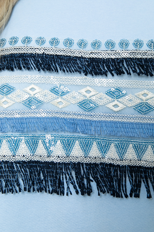 - Свитшот из хлопкового трикотажного полотна(футер трехнитка) свободного силуэта(ткань производство Турция) с отделкой трикотажной рибаной и декоративным элементом в виде пайеток и бахромы.